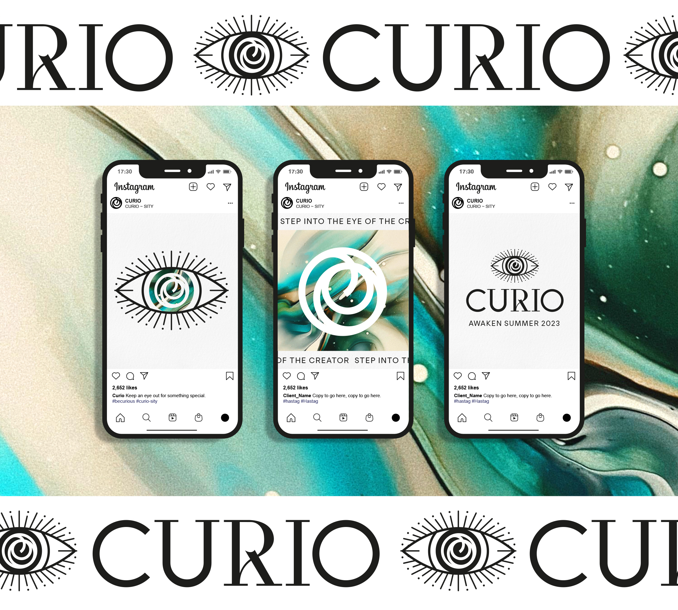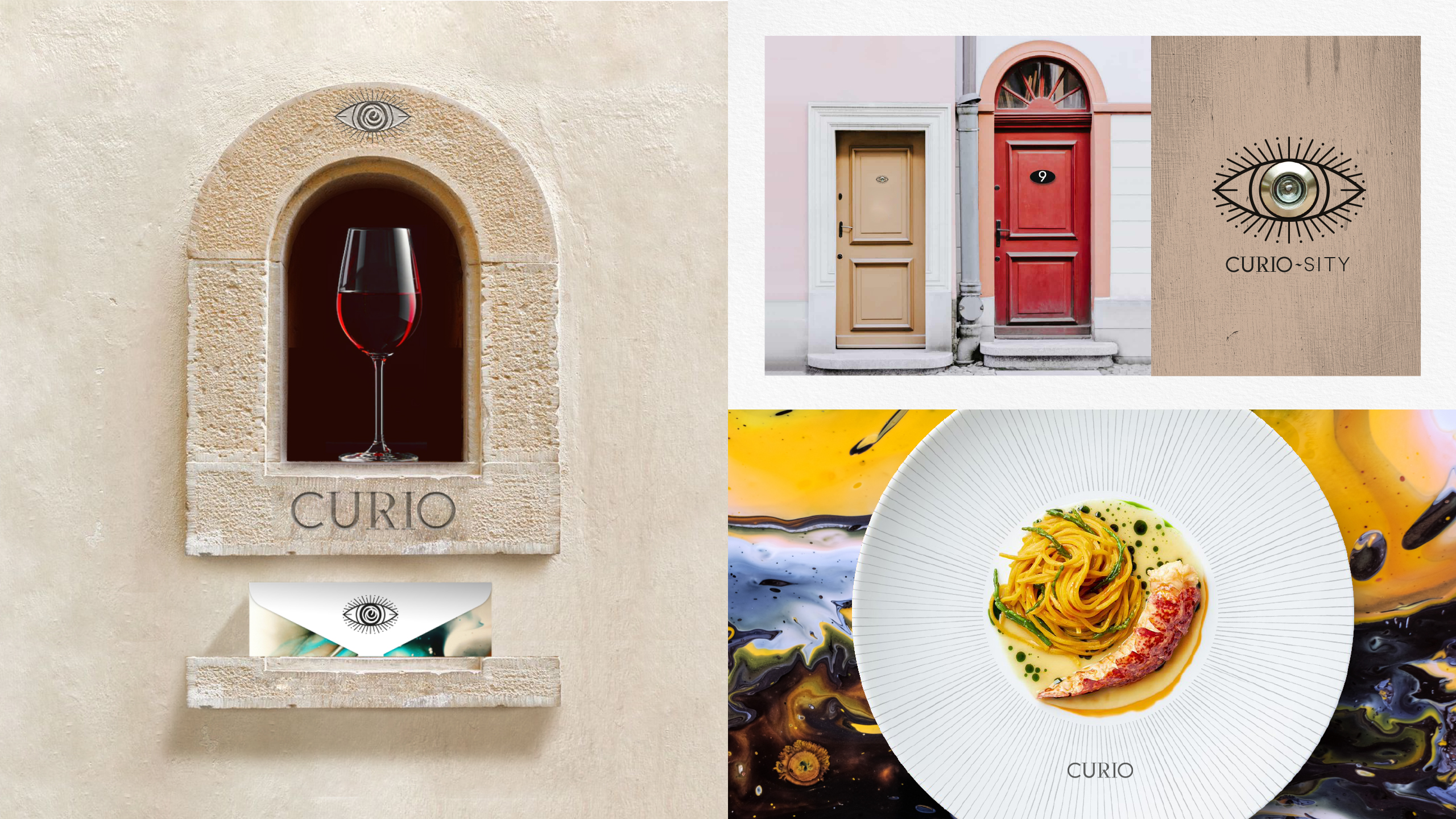 The name Curio is from the curiosity and intrigue of fusing Italian pasta and Japanese tradition to create a unique product, design is crafted to reflect this curiosity and reward the consumer. The logo is inspired by the all seeing eye of providence, depicted in the holy trinity, with the pupil represented by a swirl of pasta transporting you to a world of texture and flavour. All from the minds-eye of the creator, the chef.