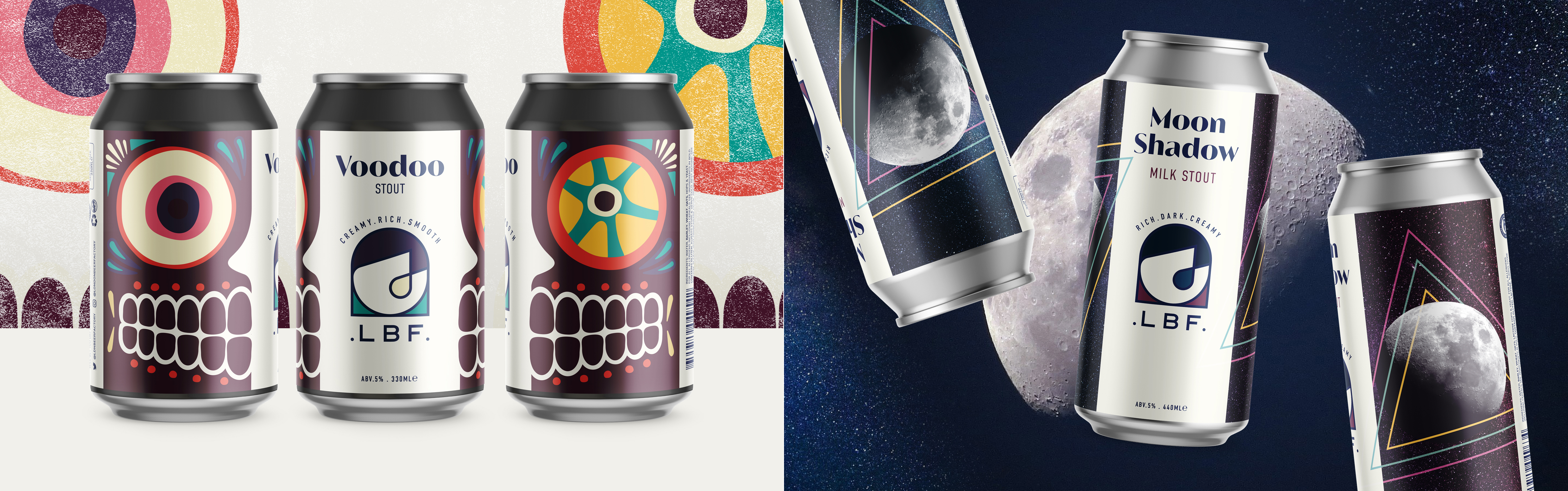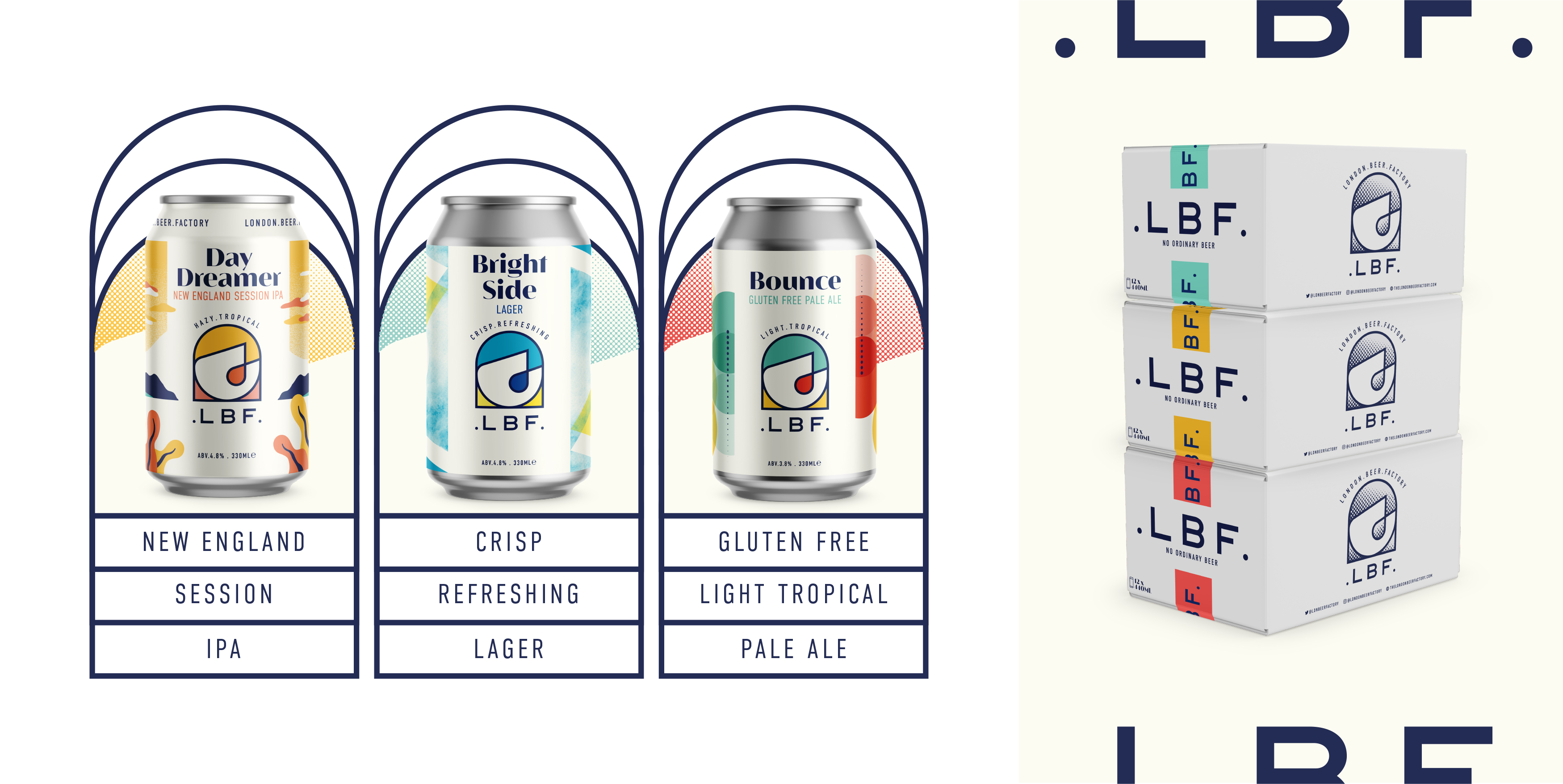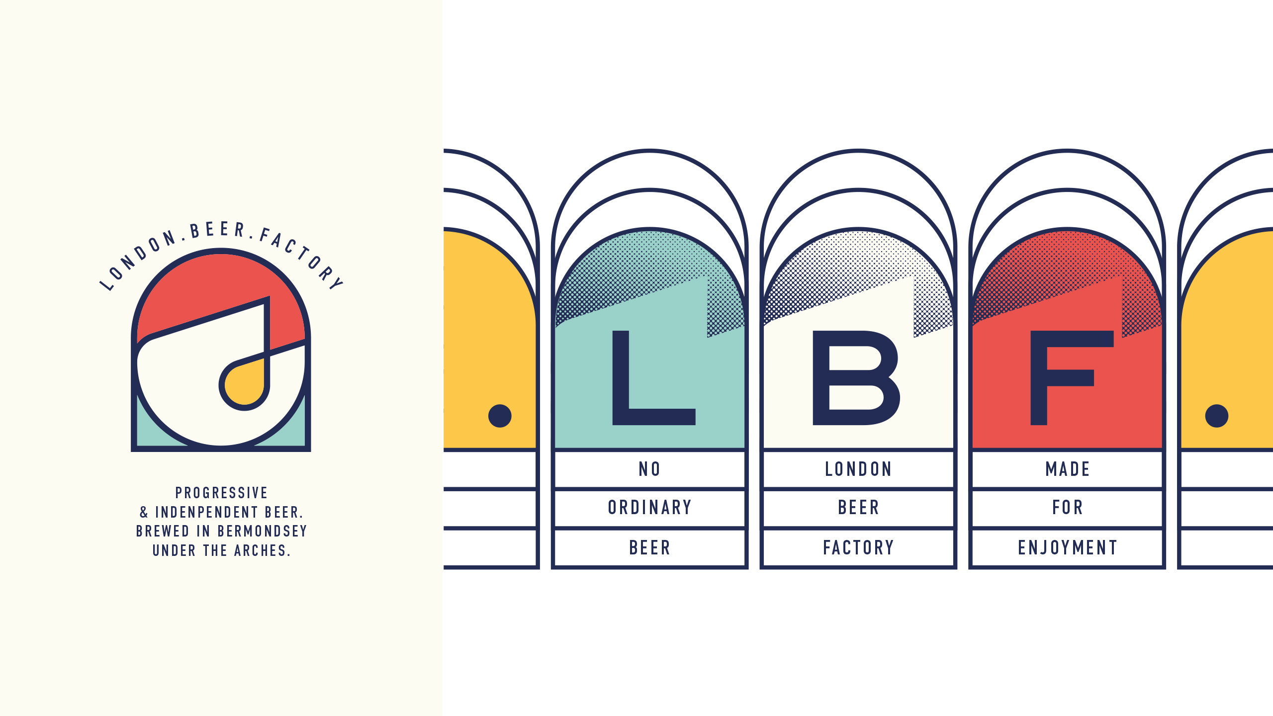 The London Beer Factory, or to be know as LBF, needed a strong band presence that had flexibility built-in, allowing each beer to express its individuality. Using the current factory logo as a starting point the brief was to make the logo less industrial. Inspired by its birth place under Bermondsey aches the new logo incorporates a simple arch, creating shapes that can be coloured to reflect the range of beers.